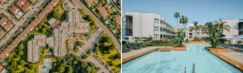 In Jerez de la Frontera, home of the Royal Andalusian School of Equestrian Art and cradle of the famed Cartujano horse, stands one of the chain’s most surprising curiosities: Hipotels Sherry Park, whose aerial shape subtly resembles that of a horse. A charming architectural detail that pays tribute to Jerez’s equestrian soul.
