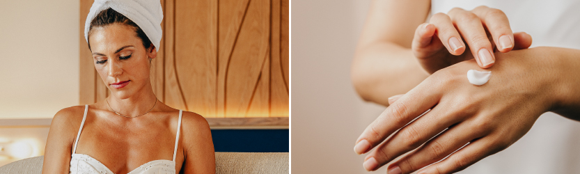 Après la douche, poursuivez le rituel avec le lait corporel Rituals, une crème légère qui hydrate intensément et laisse un parfum délicat et apaisant. Appliquez-la lentement, profitez du calme ou du bruit des vagues… un moment pour vous, tout simplement.