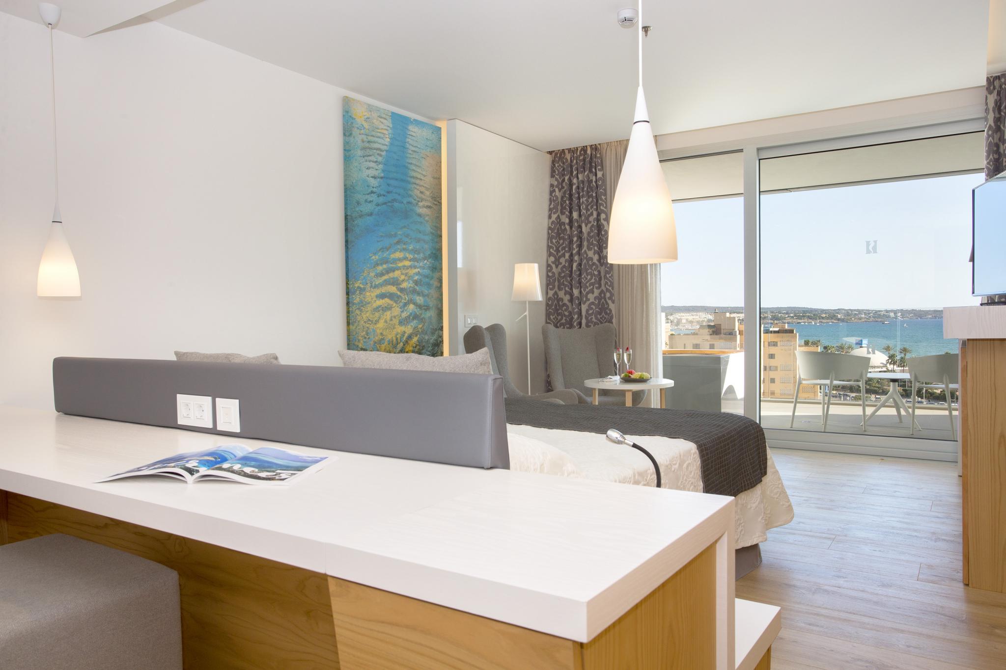Serenity Suite Vista Mar La Serenity Suite Vista Mar (82 m²) del Hipotels Playa de Palma Palace ofrece amplitud, privacidad y vistas al mar a pocos metros de la playa. Dispone de salón independiente, dormitorio con cama King size o 2 camas twin y baño con bañera y ducha.